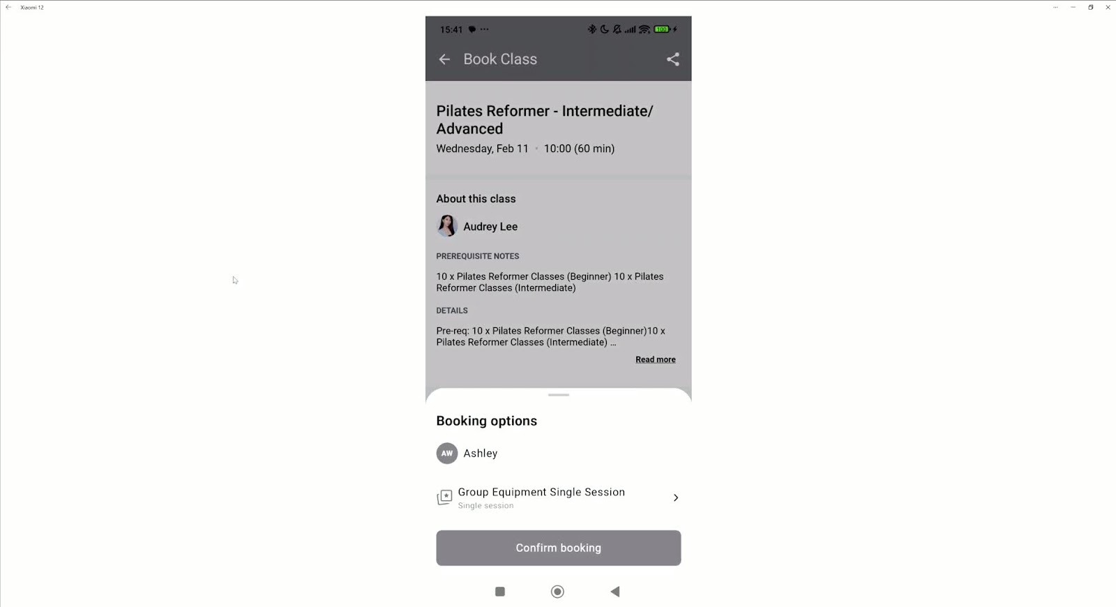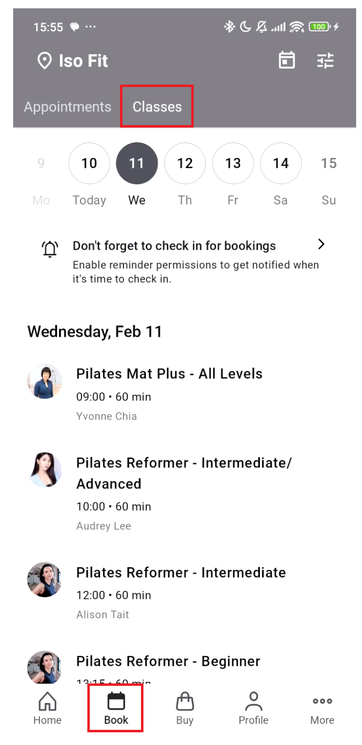 Select a class (e.g., reformer class) and choose the date and time.