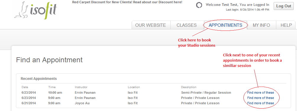 If you have visited us already, there will be a "Recent Appointments" section, after you click on the “Appointments” tab. Click on the link "Find more of these" next to the appointment type you would like to book to search for appointments of the same service type and with the same instructor. You can then select a slot that suits you. If you would like to refine your search, click on the "Edit Search" button at the top of the page. You can filter by Service type, Instructor, and Date.