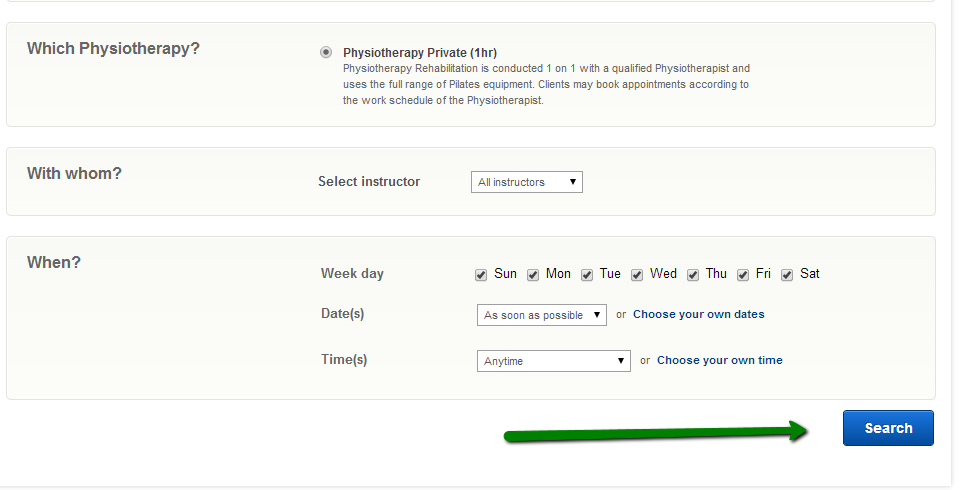 After you have selected the specific appointment, you can then filter your search by instructor, and date. Click on the Search button to give you all the available appointments for this search.